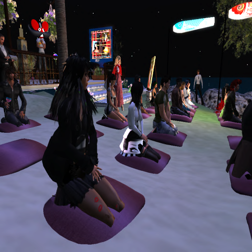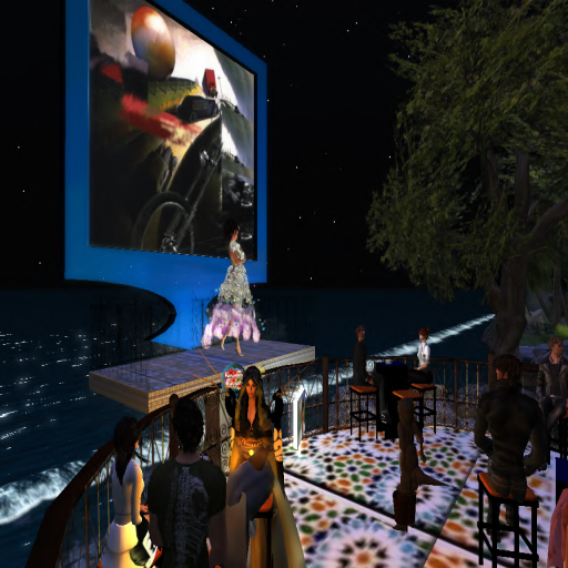 After the applause died down we moved up the stairs to the bolero bar, where I leaped up on the small balcony stage and began to read on stream with my chosen music to a capacity crowd of 46 avatars at the peak. From my end it was wonderful and from what I could read in chat, it seemed the audience also agreed. I will include a few pictures from this part of the event and also a sound clip of a live reading of one of the poems. The waves crashed below… the night was full-mooned and magic was in the air.