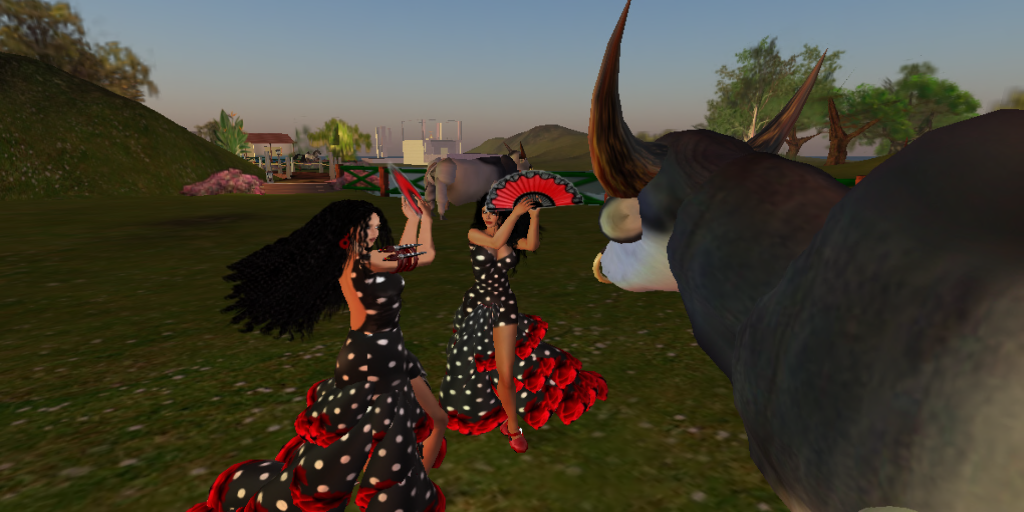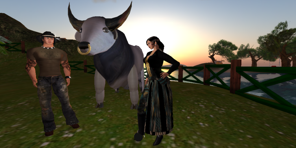 After that I took him back to my ranch where he was well-fed, well cared for, ridden to keep him friendly and entertained by flamenco dancers on a daily basis, and this helped him get over his initial aversion to the color red too. Through the miracle of virtual cloning he had many just like himself to keep him company, but if you ever come to visit my ranch (and you all are most welcome) you will recognize Vector from all the rest as he is the only one who has a gold piece of ring piercing in his nose to show him off as the original bull of this story.