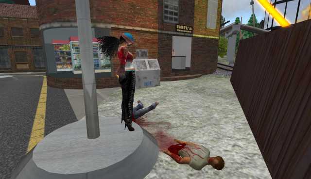 Outside the convenience store lay a poor victim cut in half and disemboweled,