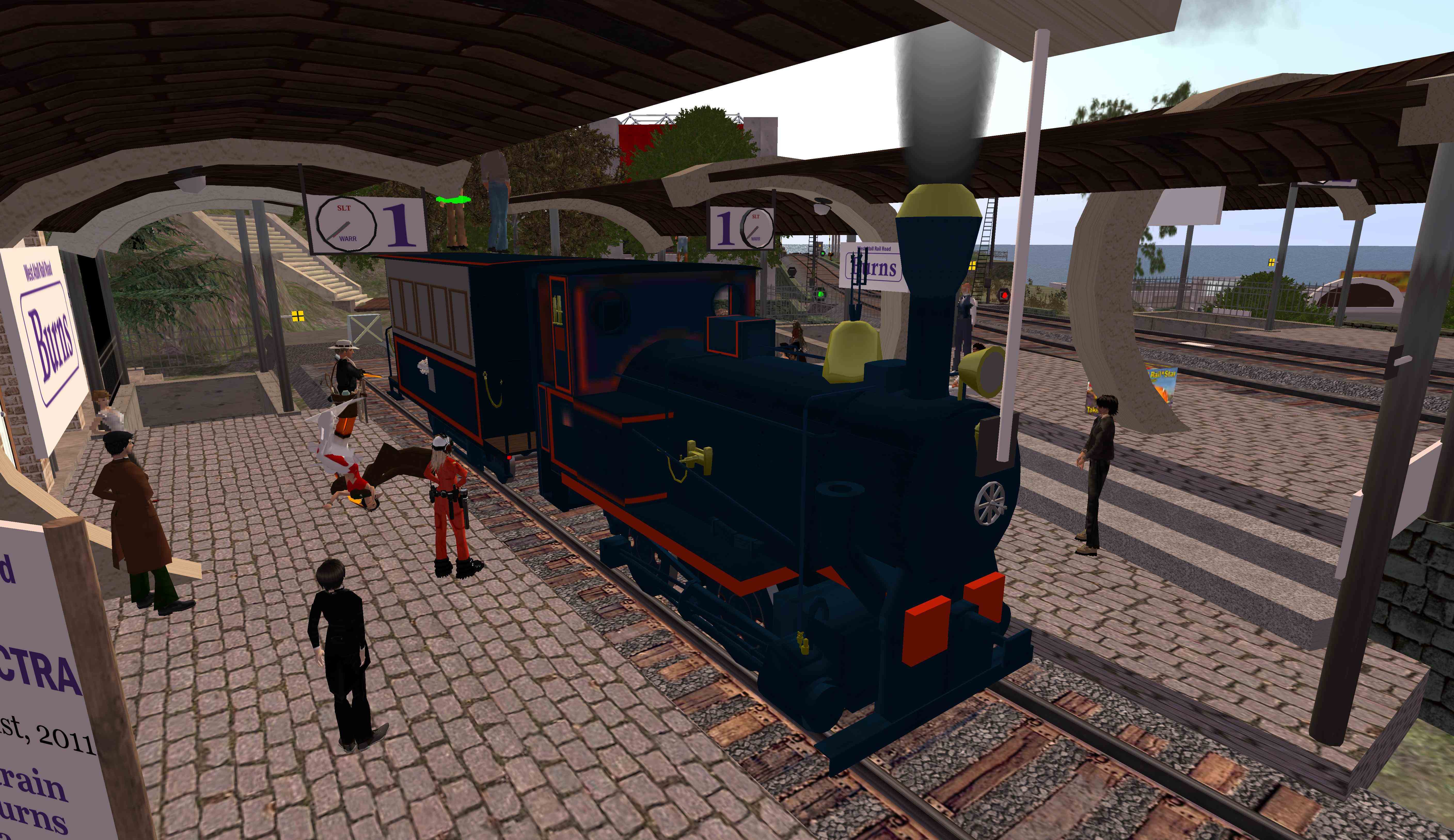 I am not a reporter, I am a poet. That said let me say that no… my title has no typos, and the gathering of more than 30 people on Tuesday night March 1, was to celebrate the peaceful extension of the SLRR on a brand new private Rail Road Line called West Atoll Rail Road (WARR) on Heterocera Atoll, between Neumoegen and Achlya. The proud owners and creators, Hilto Meridoc and Myuki Mills greeted everyone, warmly and translators buzzed and gestured in both English and Japanese. We all gathered at the brand new Burns Station situated at the beginning of the line… or the end of the line, depending if you take a glass is half full or half empty point of seeing things, and before very long, we were a happy crowd all waiting to get on the inaugural ride on this virgin rail road track. My train riding buddy of the railsMenubar Memorial and I felt very pleased to be invited by Jer Straaf to come and share this happy moment with his friends. I also am a card carrying SLRR member and wanted to show my support for any project that extends this wonderful Mainland railway system.