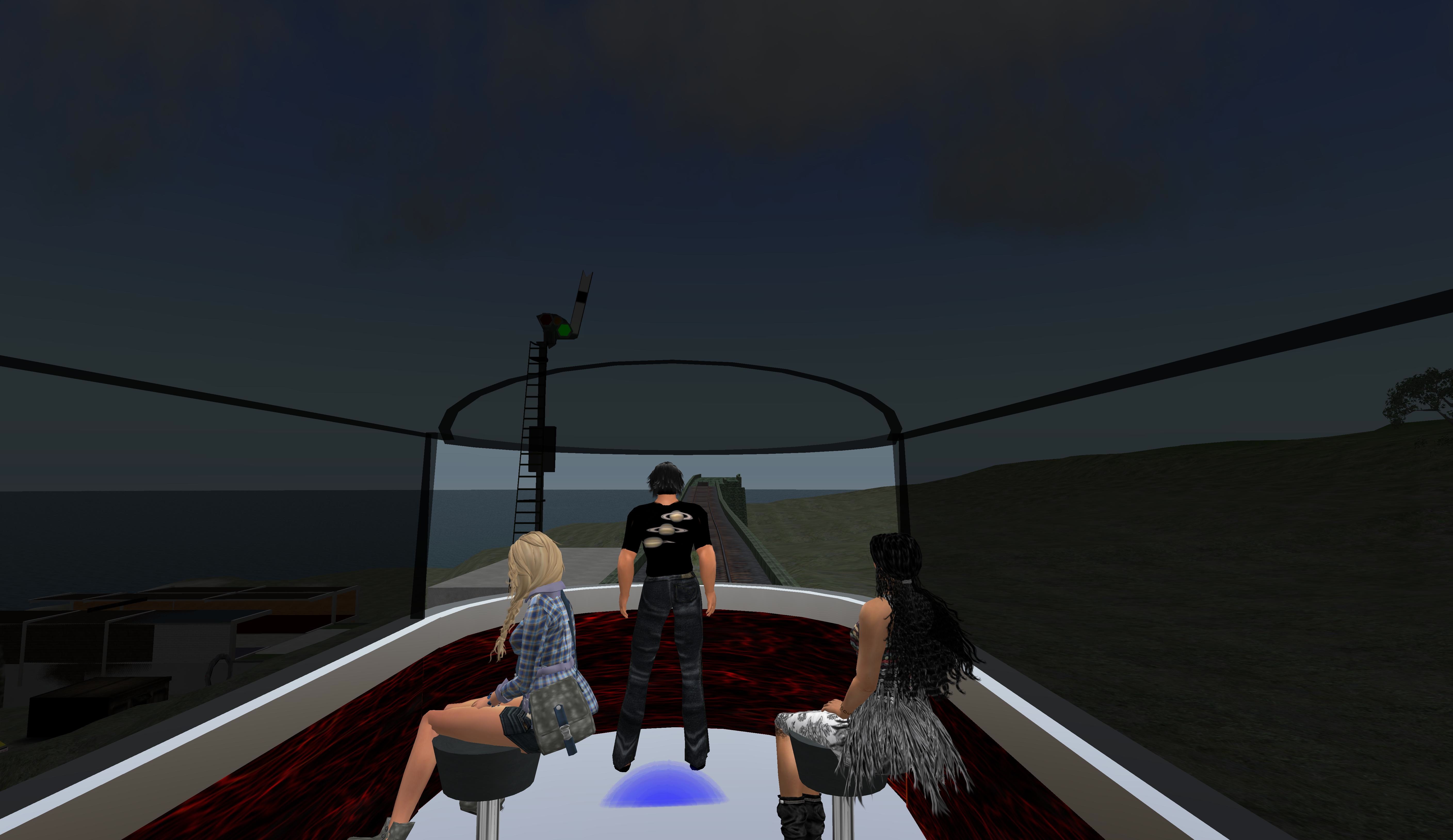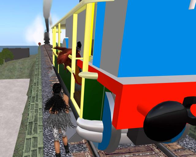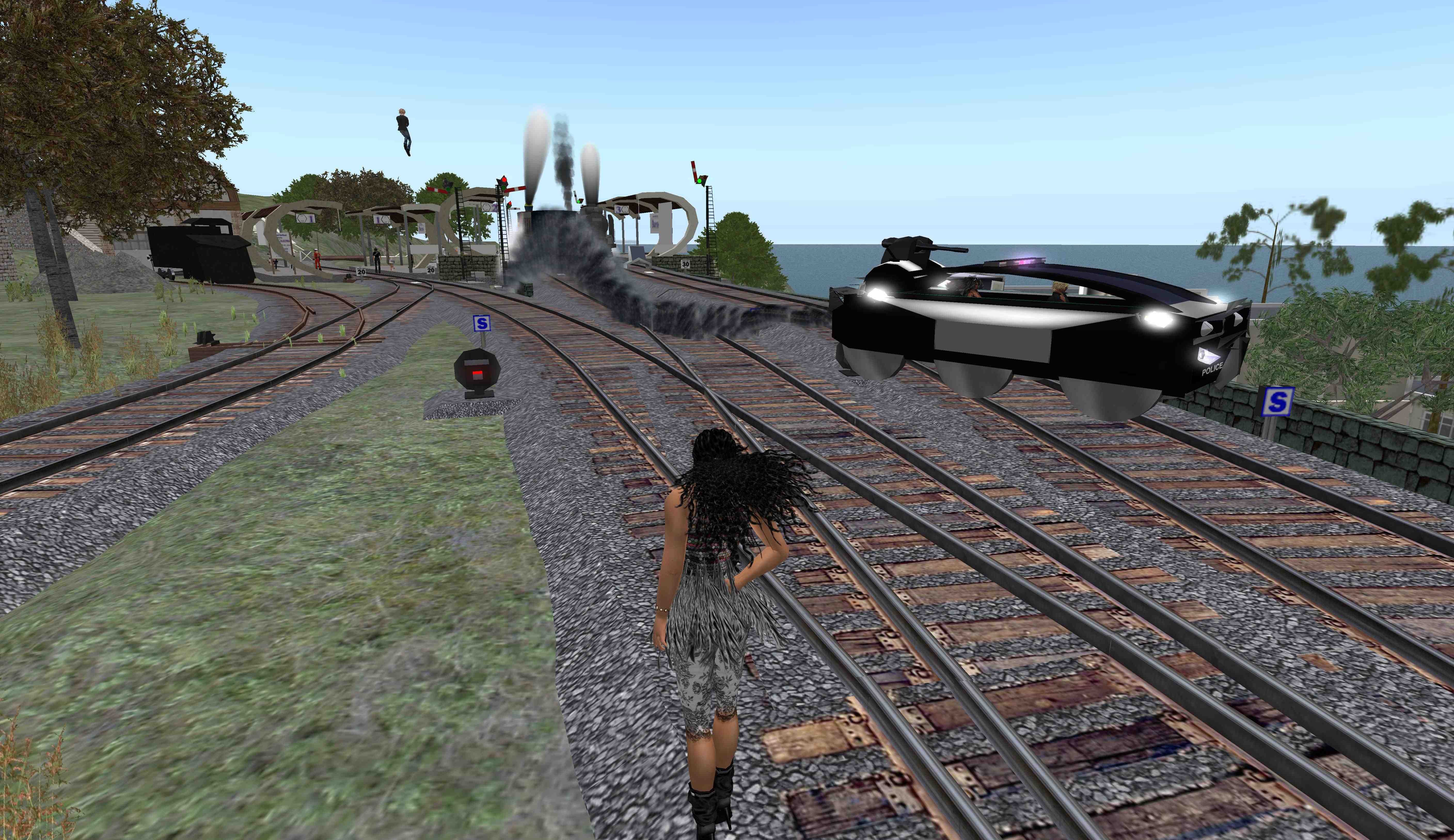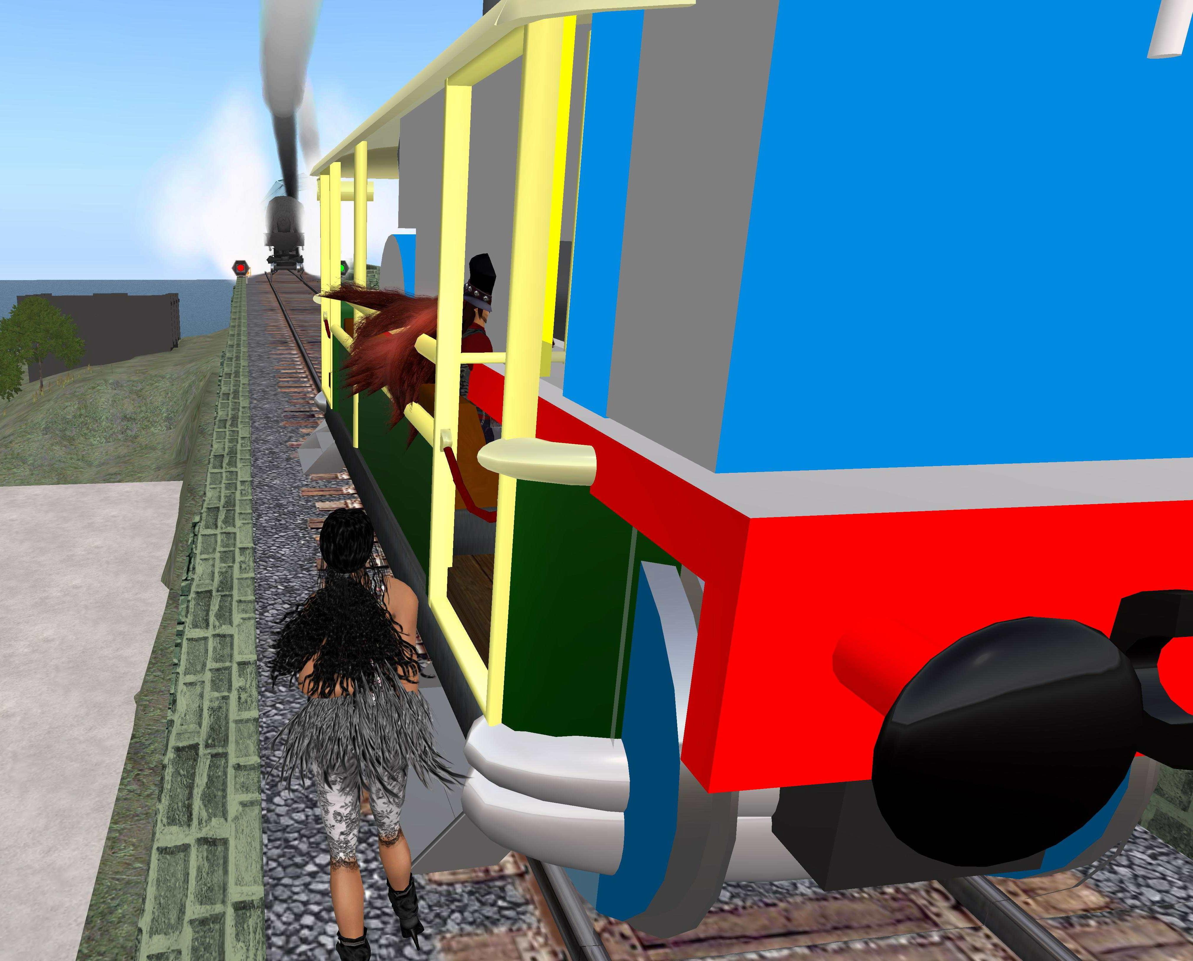 I closed my eyes tight and let myself drop back to land, and hit the tracks just barely missing being run over by the train that Menubar was riding in, the one that had been traveling behind us. It was pretty obvious sim crossings are not fond of more than 10 people riding in a train car and as Menubar remarked later, SL was being in general particularly cranky and petulant that Tuesday night. After brushing off the dust I saw the familiar red mop of long hair blowing out the open window and ran as fast as I could to jump on and ride in the same train Menubar was in.