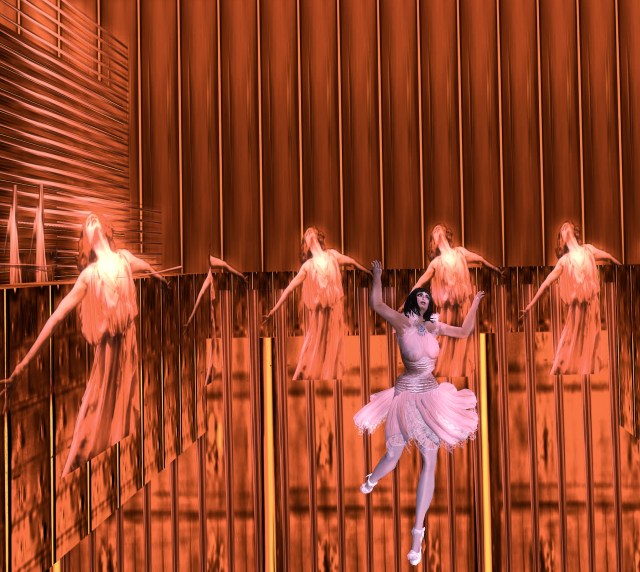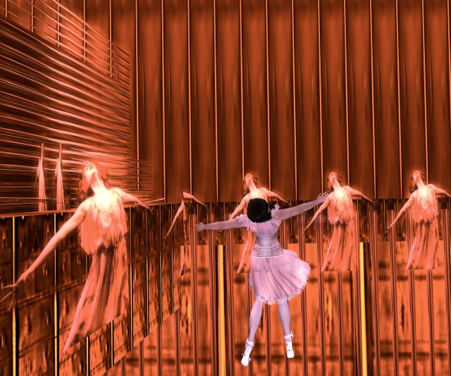 I look back at her as I am caught in the updraft of a very new dance. It takes me and there is no refusing it. The music switches and changes, and I am now dancing with what I feel are hologram images of more dancers, all of them so graceful and supple, their eyes closed in ecstasy. But they too sing to me in the most beautifully high clear voices, that harmonize with the music,and I open my mind wishing to be like them even for a few short minutes, for the length of this dance. Then I am them. I sing in floating notes of pinks and bronzes and I feel what the next step will be and we are truly Glorious.