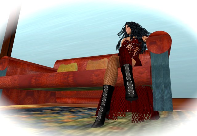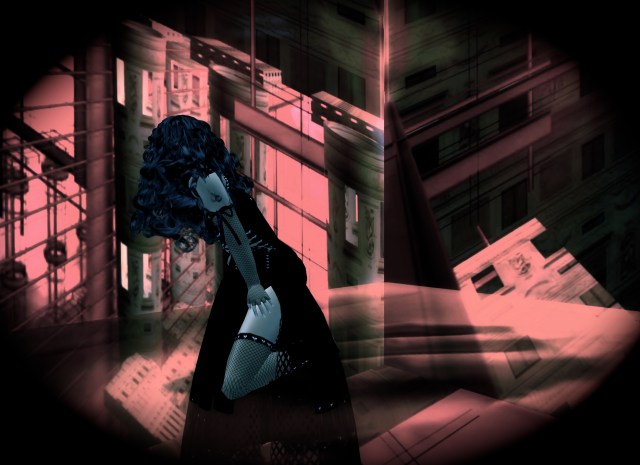I am now the one on the couch, but this room, like my bed before, is not in my waking world. I am dressed in clothes I don’t own, just as I saw myself dressed on the other side of the barrier. I am in the same clothes, and I am wearing fishnet stockings and laced-up boots. I don’t think I own either of those things nor have I ever had them in my closet. I am looking towards a window and I know I am waiting for some kind of sign, or something to happen. I have to make a supreme effort to move my head out of the position I have it turned towards. I feel stilled, and the very air itself fights me to change my position. I am like a cloned copy of a full-length sculpture of myself that someone has set on a couch as a prop simultaneously in two different worlds. I stop struggling to understand at this point, and let my eyes wander over the scene. The colors are magnificent, purples and greens on the bronze leather-tooled couch, against walls of antique pink and rose. The first thing I think about, is how I will paint this scene, and what paints I might use. I allow myself a quick glance below my feet and feel the rush of being thrown quickly off-balance, by the sheer height, clearness and depth of the floors, with many more floors below this one. Heights have always made me reel with vertigo.