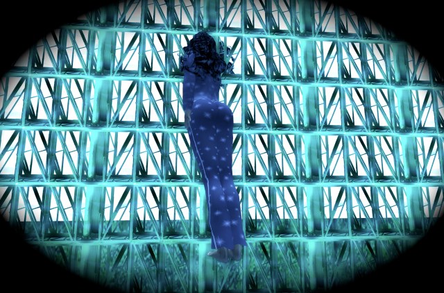 I decide to get up and inspect my surroundings, and the feel of the floor on my bare feet is like cool glass. I avoid as well as I can the angle of looking down, because vertigo tugs at my balance when I do peer below me, at the endless layers and floor, all semi transparent, yet with patterns and images superimposed. It is mind wrenching. Although the walls look solid, and have three-dimensional bars and tubes, that seem to block the way, when I press my hand against one wall, I find it sort of gives to my push, but at the same time pulls me into it, much like it did to the disappearing spheres. My first reaction is to pull back, as it seems to be a very strong force, and I would lose control if I allowed it to grab hold of me. I take turns, trying the other walls, pressing lightly my palms against them, and testing them. All of them but the first seem to be solid, so I am obligated to overcome my fear and allow the wall to take me through, unless I wish to stay trapped in this small room with only my bed in it, and nothing more