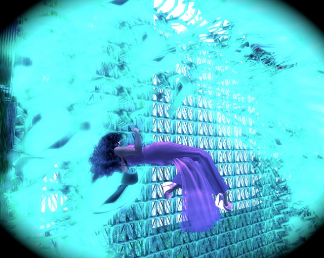 My arms shoot out ahead of me instinctively, and feeling separated from the sphere, causes me a moment of panic, which I talk down, as I see I am coming to a curtain, a thin gauze that divides this side from another, or so I am guessing. It is like a border crossing, and only I have my papers in order to make it across…or this I hope. The curtain parts for me, as I go slowly gliding into it, through it, but as soon as all of me reaches the other side, I am abruptly placed on my feet, and my solo flight is halted rather jarringly.