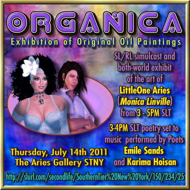 While the Real Life exhibition of Monica Linville (Littleone Arias in SL) is taking place at the House of Creative Soul in Saratoga Springs, NY, the Second Life simultaneous event will take place at the Aries Gallery STNY, and we will be seen and heard reading there by not only the audience in SL, but also in the gallery in N.Y. through a simultaneous broadcast. Those gathering in SL at Littleone’s gallery will also be able to see the show in N.Y. through a live video stream. This is a first for me and for Emile and we are so excited about being invited to participate. Littleone is a very accomplished and amazing artist, and I have written several original poems inspired by the paintings for this show. After our reading, classical guitarist Voodoo Shilton will perform at 4pmslt.