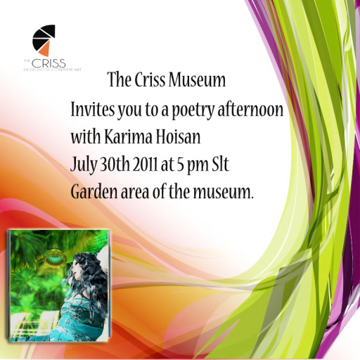 The Criss Museum of Contemporary Art in Second Life, one of the first artistic venues in SL that invited me to read my poetry, has called me back again, for a reading, this coming Saturday at 5pmslt. Katie and Scottj Criss, the proud owners, are celebrating a new location for their beautiful and tasteful gallery, that is home to some of the finest virtual and real life art to be found in SL.