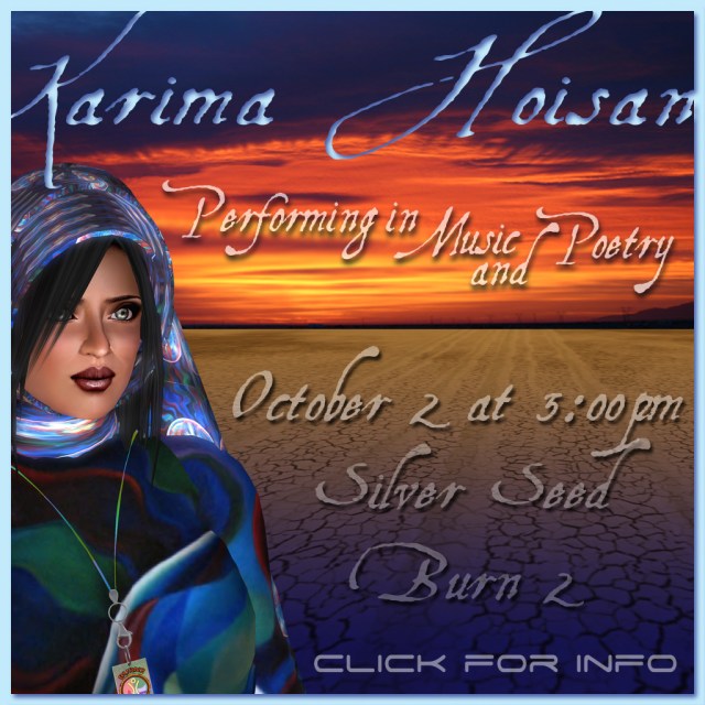 I’m really excited about this reading coming up at Burn2 (Sl’s version of Burning Man) as it is the first time I have ever performed at one. I have chosen a good selection of favorites as I know this will be a whole new audience for me. I hope you all, my readers and friends can join me at Center Camp on Sunday at 3pmslt. Get Your Burn On dressing up creatively, and show your style and join the community. This year’s Burn2 is looking so good. The Art is incredible, and a line up for an entire week of great music, poetry, and performances. So I hope you come and join me this Sunday at 3pmslt.