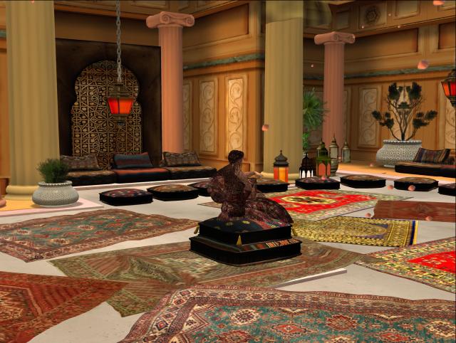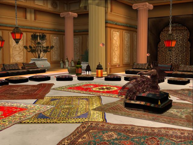 I have been reading at an event, called “Tropical Reflections” once a month in Costa Rica Sims, the virtual equivalent of my RL country of nationality and residence. For those of you who attended my readings there, you will recall it was a small suburban park setting, pillows on the grass, and casual picnic style seating. Well the poetry venue as well as the Estate itself, has changed hands, new owner, and new ideas. It’s still Costa Rica at heart, all the wonderful amenities it has always provided for its residents , and visitors alike, but now more creative ideas are being put out to try and one of them is this beautiful Arabian style pavilion that will be the new venue for my readings there.